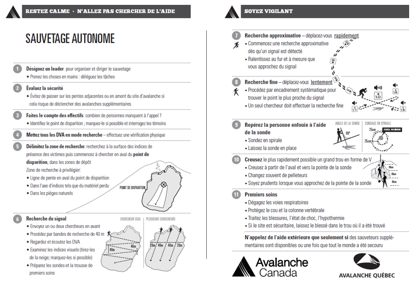 Si vous voyez ou entendez une avalanche et que vous sentez la neige bouger, criez « AVALANCHE ! ». En cas d’accident, il est possible que vous perdiez le fil de ce que vous avez appris dans vos cours de sécurité en avalanche. C’est pourquoi la carte de sauvetage autonome retrace, étape par étape, la marche à suivre pour effectuer un sauvetage optimal.
