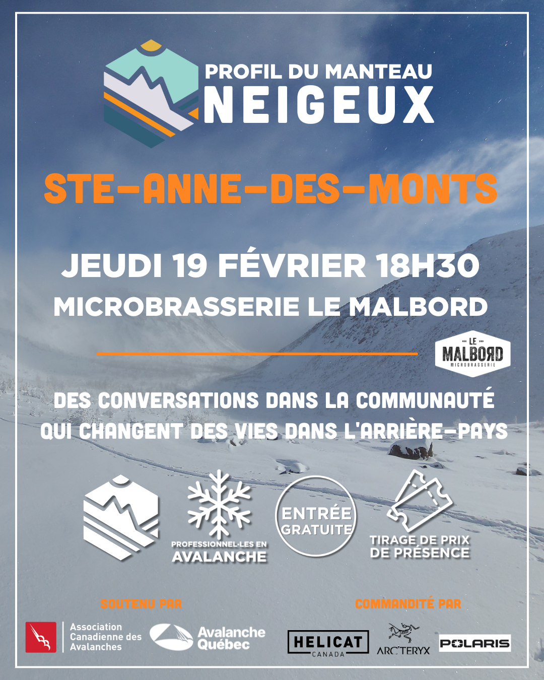 Le jeudi 19 février 2026 dès 18h30, joignez-vous à nous pour le deuxième événement « Profil du manteau neigeux », animé et organisé par Avalanche Québec. Il s’agit du premier chapitre francophone et dans l’est du pays des mythiques soirées State of the Snowpack. Un rendez-vous mensuel à ne surtout pas manquer !