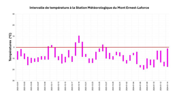 À notre station météorologique du mont Ernest-Laforce, les températures ont varié entre 10 °C et -20 °C avec plusieurs jours où les températures maximales sont passées au-delà du point de congélation. Donc, malgré le début de décembre assez froid, la deuxième partie de ce mois s’est rapidement et radicalement réchauffée.