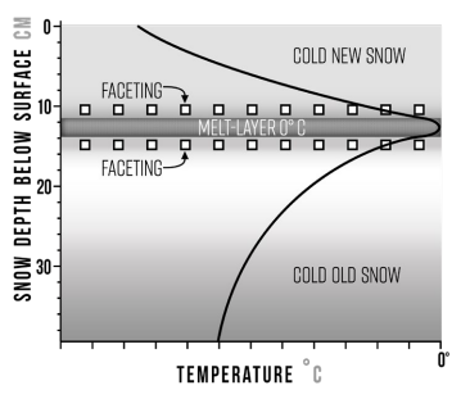 Ce processus se produit quand une croûte de regel encore mouillée (souvent formée par une forte radiation solaire ou une faible pluie) se fait ensevelir par de la nouvelle neige. Puisque celle-ci est théoriquement autour de 0 °C, elle crée alors un gradient fort à cette interface et la formation de grains à faces planes est donc possible entre la croûte de regel et la nouvelle neige. Le processus est plus important si la nouvelle neige a une faible densité et est suivie d’une nuit froide et dégagée.