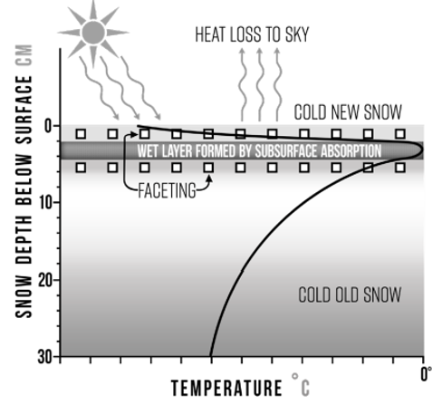 Dans ce contexte, nous parlons alors de near-surface faceting, ou du développement de grains à faces planes en surface du manteau neigeux. Les travaux de Karl Birkeland présentent trois processus météorologiques distincts qui favorisent ce processus : Radiation recrystallization, melt-layer recrystallization et diurnal recrystallization, que nous verrons plus en détails.