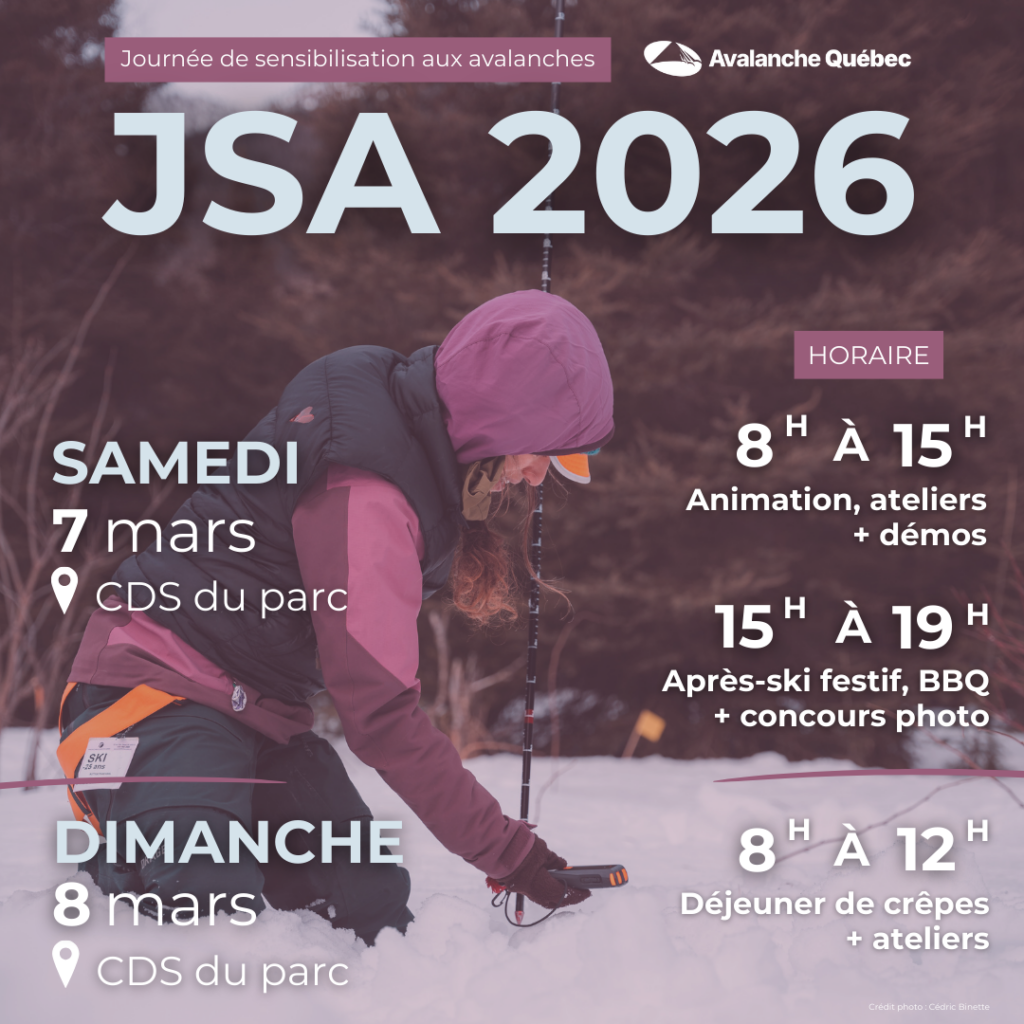 Joignez-vous à nous le samedi 7 et le dimanche 8 mars au centre de découverte et de services (CDS) du parc national de la Gaspésie pour les Journées de sensibilisation aux avalanches d’Avalanche Québec. De nombreuses activités seront proposées au CDS lors des deux journées !