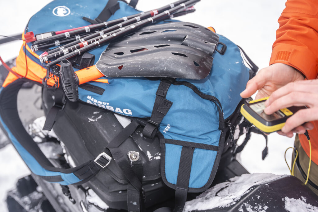 Vous avez suivi un cours de sécurité en avalanche, avez consulté les ressources proposées et souhaitez maintenant vous équiper du nécessaire pour des sorties sécuritaires ? Dans un sac à dos, gardez l’essentiel pour effectuer la recherche et le sauvetage de vos partenaires. Si tout votre équipement de sécurité se trouve sur la motoneige et que celle-ci se fait ensevelir, vous serez dépourvu·e de votre pelle et de votre sonde et il sera très difficile et beaucoup plus long de retrouver les victimes. Leurs chances de survie seront alors très basses. Procurez-vous un sac à dos gonflable (airbag) afin de diminuer la probabilité d’ensevelissement et apportez l’essentiel de premiers soins et d’évacuation.