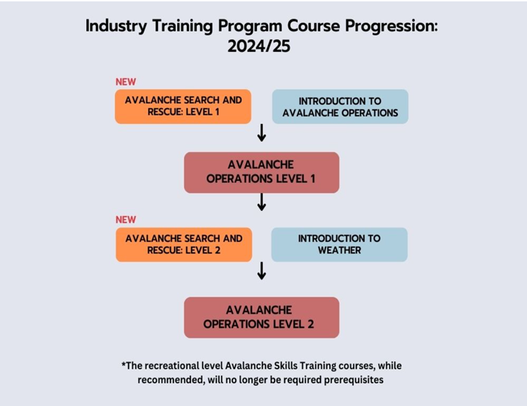 Les prérequis pour le cours Opérations d’Avalanche Niveau 1 ont changé, mais seront tous disponibles en français. Le nouveau cours AvSAR 1 sera désormais un prérequis de même que le cours en ligne sur le système de commandement des interventions (SCI-100). De plus, les cours récréatifs offerts par Avalanche Canada (CSA1 et CSA2) seront maintenant recommandés plutôt qu’obligatoire. Finalement, le cours en ligne Introduction aux Opérations d’Avalanche demeurera encore un prérequis, car il présente les sujets qui seront mis en pratique dans le cours Opérations d’avalanche Niveau 1. Pour consulter la nouvelle progression des cours, cliquez ici.