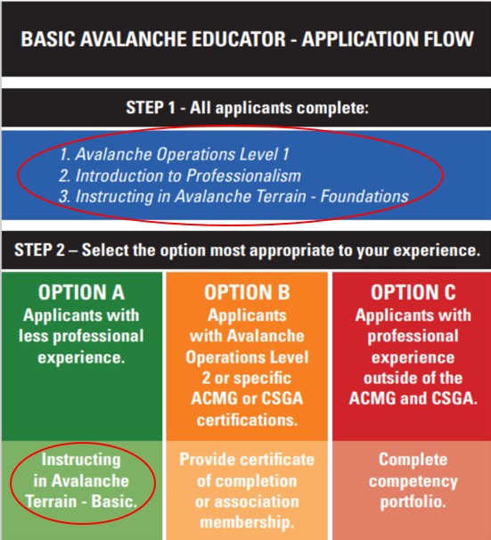 Selon l’expérience d’enseignement du ou de la candidat·e ou selon ses certifications professionnelles (ACMG ou CSGA), il sera possible d’accéder directement au statut de « membre éducateur de base » en complétant un portfolio. Si l’expérience d’enseignement est minimale, le cours terrain « Fondements de l’enseignement en terrain avalancheux » est nécessaire.
