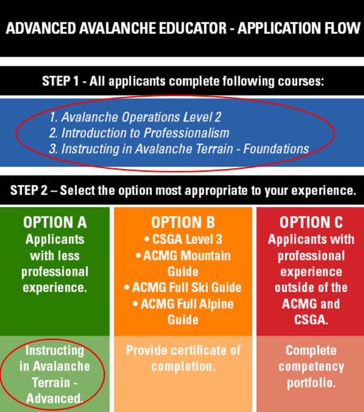 La catégorie « membre éducateur avancé », quant à elle, permettra d’enseigner les cours « CSA2 » et « Gestion en terrain avalancheux ». Pour appliquer, il est obligatoire d’avoir complété le cours « Opérations d’avalanche Niveau 2 », le cours en ligne « Introduction au professionnalisme » ainsi que le cours en ligne « Fondements de l’enseignement en terrain avalancheux ».