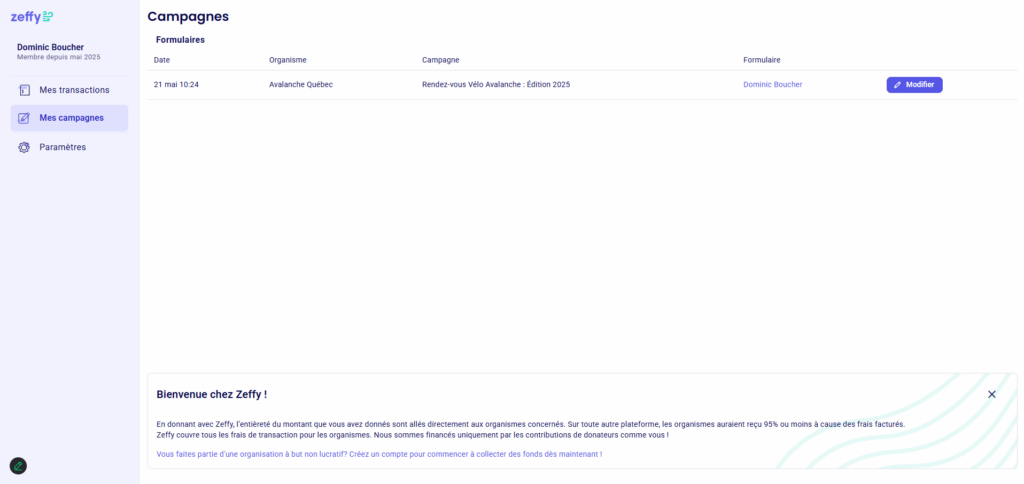 Si vous ne personnalisez pas votre campagne, les textes proposés par Avalanche Québec s’afficheront. Il est aussi possible de vous créer un compte Zeffy en suivant les instructions reçues par courriel. Vous pourrez alors aller dans «mes campagnes» pour modifier votre page de collecte de fonds, puis dans l’onglet «informations générales».