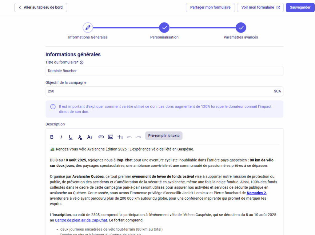 Le montant minimal de l’objectif de la campagne de levée de fonds est de 250$, mais peut-être plus élevé si vous le souhaitez. Il est également possible d’ajouter votre photo de profil qui sera intégrée à votre page personnelle de collecte de fonds.