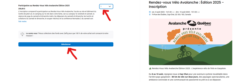 Après avoir confirmé votre inscription au Rendez-vous vélo Avalanche 2025, vous devez préciser les informations supplémentaires, choisir de soutenir la plateforme Zeffy ou non (facultatif), saisir votre méthode de paiement pour l’inscription à l’événement et fournir vos informations personnelles dans les différents formulaires à compléter.