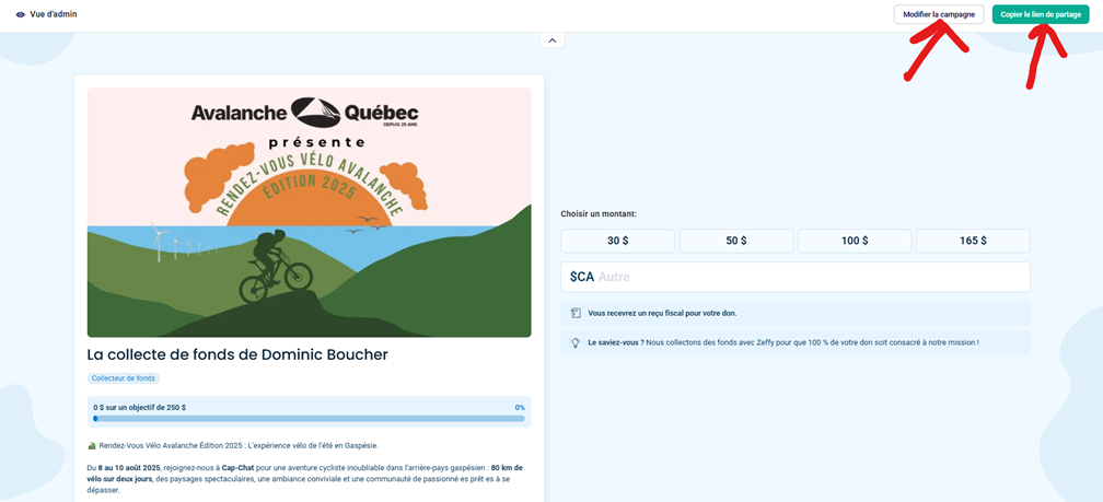 Finalement, il ne restera plus qu’à suivre les instructions reçues par courriel pour partager votre page personnelle dans votre entourage. Vous serez alors prêt·e à commencer à collecter de fonds et contribuer à la campagne de financement du Rendez-vous vélo Avalanche au profit d’Avalanche Québec ! Si votre campagne a le vent dans les voiles, vous pouvez également la modifier pour en augmenter l’objectif et ainsi accroître vos chances de gagner le support vertical pour six vélos Revert de Thule !