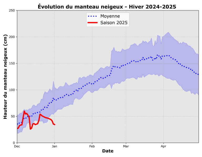 Cependant, malgré ces pics de chaleur, la température moyenne mensuelle s’est établie à -8 °C, soit seulement 1 °C au-dessus de la normale. Ce sont donc les trois épisodes de redoux, particulièrement marquants, qui ont fortement influencé les conditions en montagne.