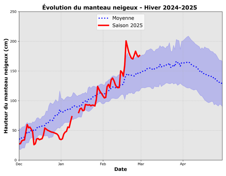 Le mois de février s’est démarqué par son activité intense et ses records de précipitations. Après un début de saison qui semblait décevant, les tempêtes de février ont transformé le paysage hivernal. Sur le terrain, ces chutes de neige ont parfois limité nos observations et nos sorties, mais elles nous ont aussi offert des conditions exceptionnelles.
