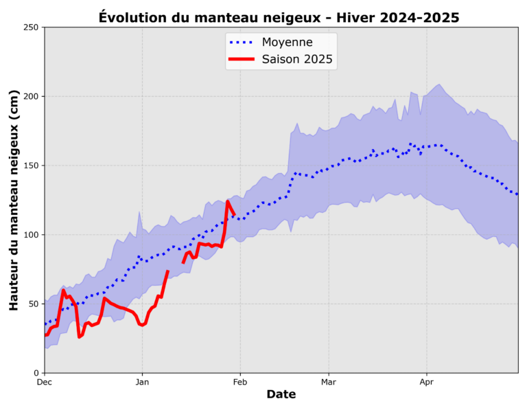Cependant, malgré ces pics de chaleur, la température moyenne mensuelle s’est établie à -8 °C, soit seulement 1 °C au-dessus de la normale. Ce sont donc les trois épisodes de redoux, particulièrement marquants, qui ont fortement influencé les conditions en montagne.