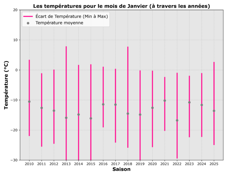 - Températures : de -25.0 °C à 2.5 °C (moyenne de -14 °C)